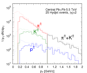 and in 125 central Pb+Pb events at 5.5 TeV/nucleon energy from Hydjet generator