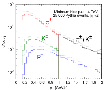 25 000 minimum bias p+p events at 14 TeV energy from Pythia generator (left);